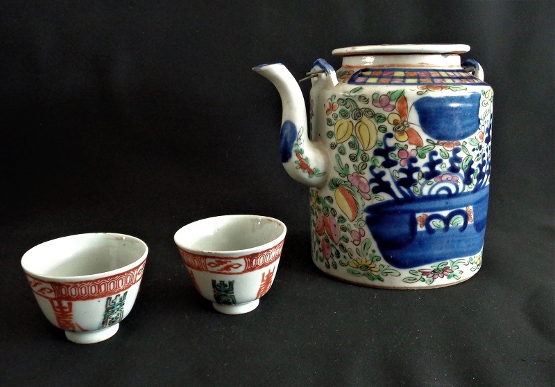 condition - basket in very good condition on the inside has the covering user wear / teapot has a ship in the edge and one cup has a hairline. Cups have a decoration with Chinese characters and the teapot richly decorated with bird / butterfly and floral decoration.